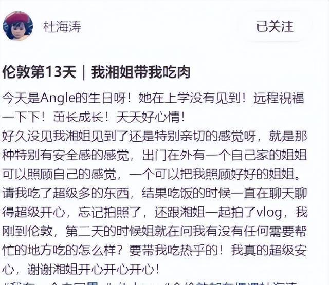 搭杜海涛不是玩闹,是资源联手 两人能认识,其实全靠李湘牵线。 李湘在伦敦陪女儿读书,常和杜海涛约饭,恰巧章泽天也在伦敦,一来二去就熟了。 2025年11月,章泽天还在社交账号晒两人合照,配文“老友记”,背景是伦敦私厨的定制菜单,评论区全在问“这俩人怎么凑一块儿的”? 别以为他们只是一起吃饭看展,背后藏着真生意。